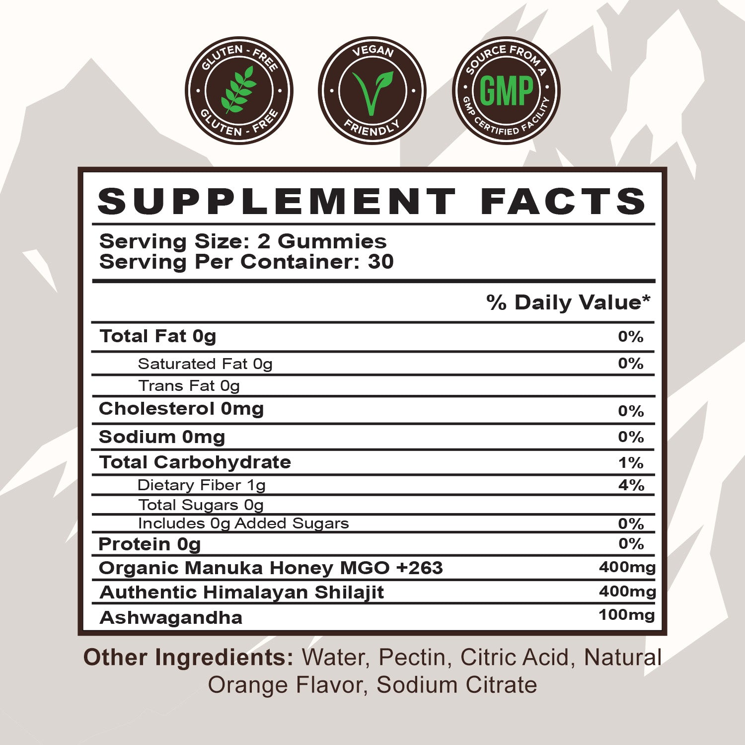 Experience the powerful health benefits of our Shilajit Gummies, crafted with Authentic Himalayan Shilajit, renowned for its potent trace minerals and fulvic acid content. Infused with Ashwagandha, a traditional herb known for its stress-relieving properties, these gummies help restore calm and balance in your life, combating the effects of daily stress and fatigue. To further enhance your wellness journey, we’ve included Organic Manuka Honey MGO +263, celebrated for its natural immune-boosting and antibacterial qualities. Together, these ingredients work synergistically to promote energy, vitality, immune health, and overall well-being.